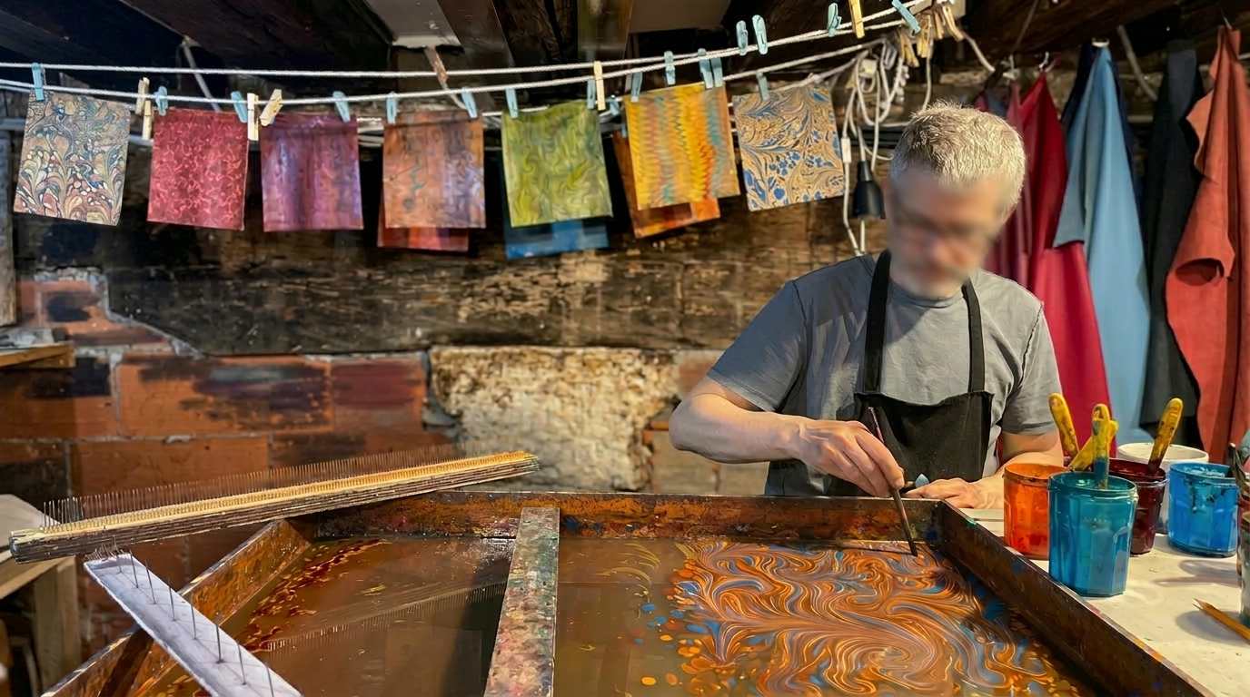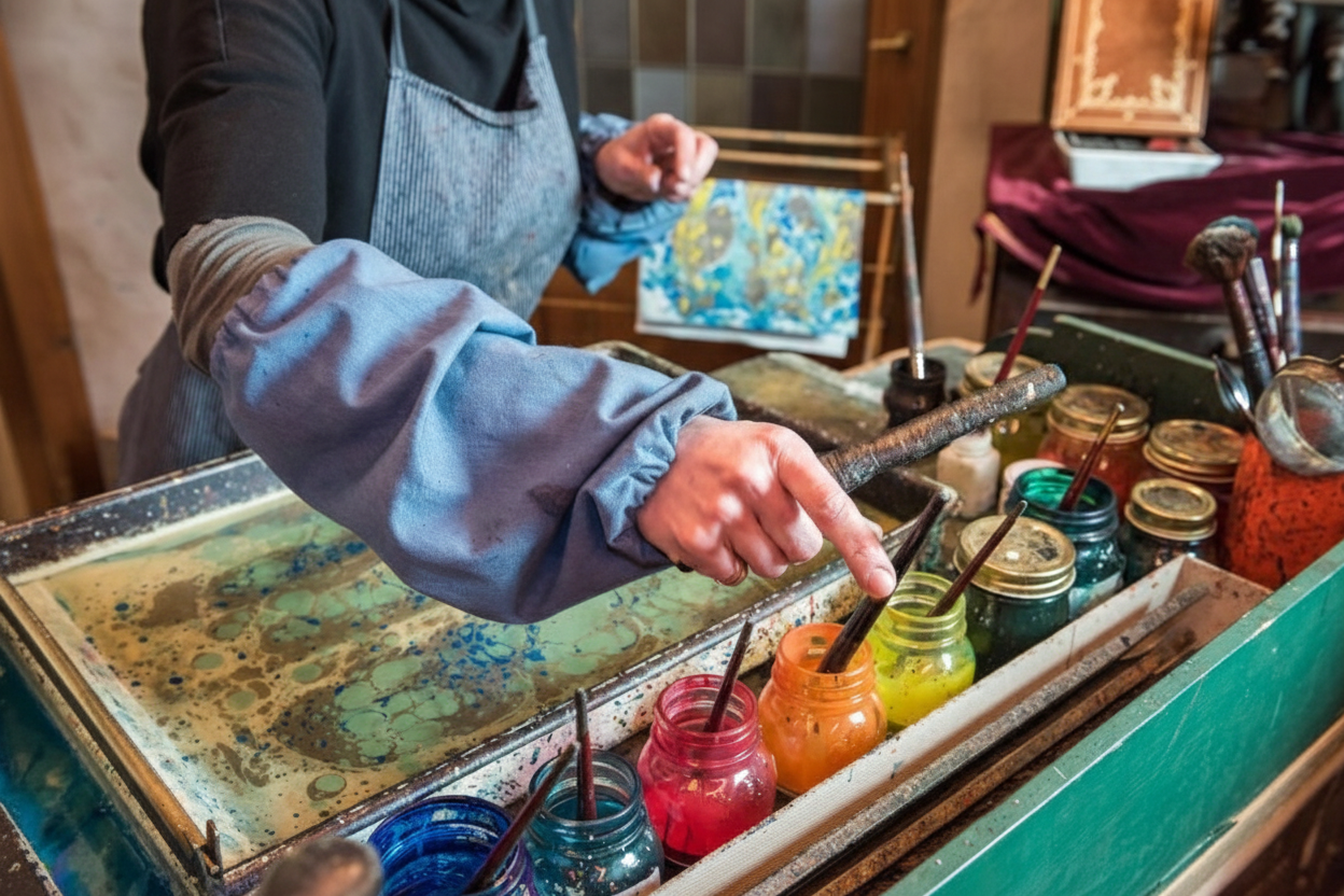 During the visit, participants will observe the creation of marbled paper using traditional techniques dating back to the 16th century, preserved and transmitted through generations of craftsmen. The process uses specialized tools, natural materials, seaweed-based solutions, and pigments similar to those employed by artisans of the past.